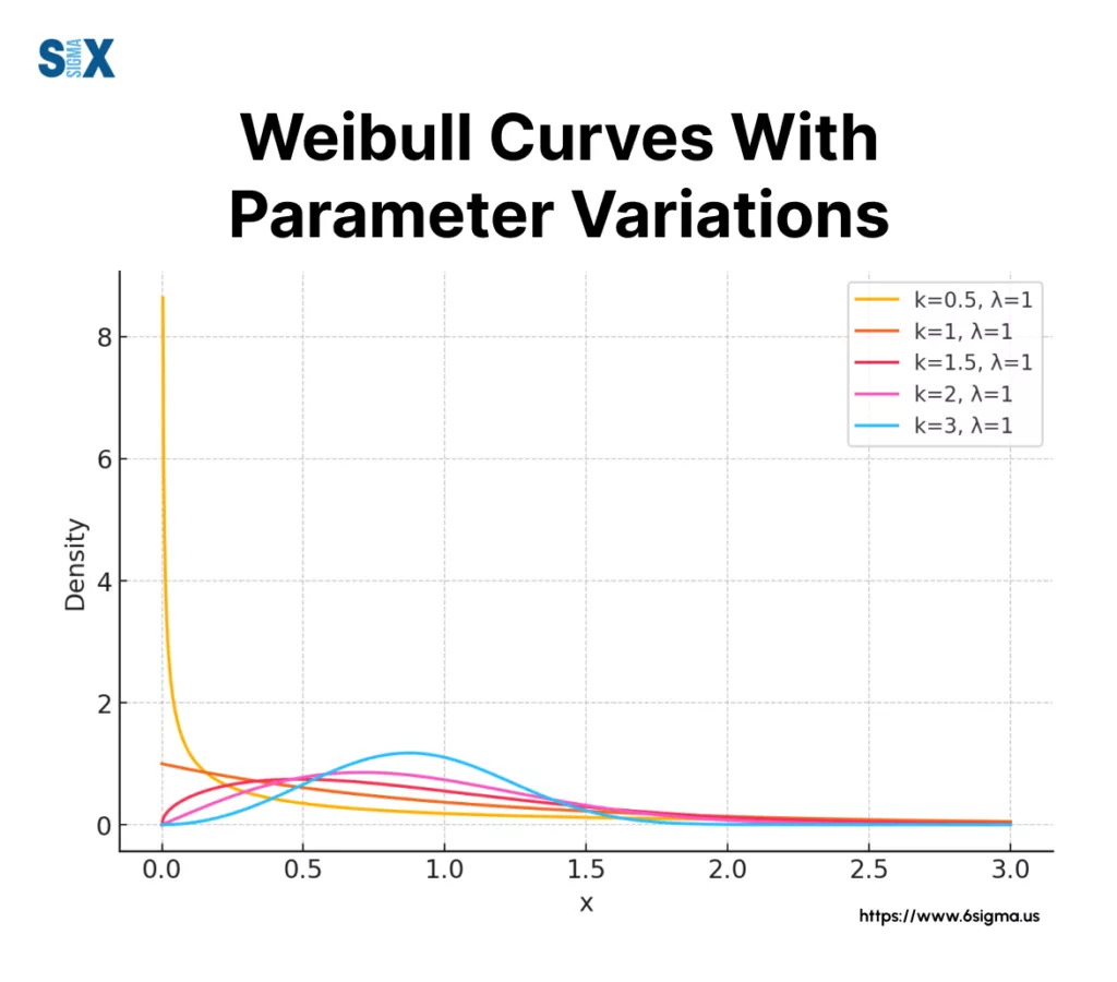 The Weibull distribution parameters work together to model different failure patterns in Six Sigma projects. The probability density function follows this mathematical form: